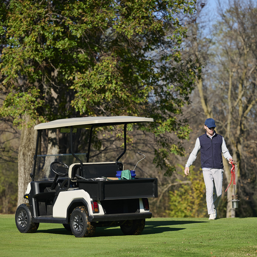 Nya Toro Vista med lastbädden/flak erbjuder gott om utrymme för att transportera arbetsredskap och skrymmande föremål på ett säkert och enkelt sätt. Lastbäddens greppvänliga struktur och upphöjda kanter säkerställer att lasten håller sig säkert på plats under transporten. Välj mellan en bensin- eller eldriven version.